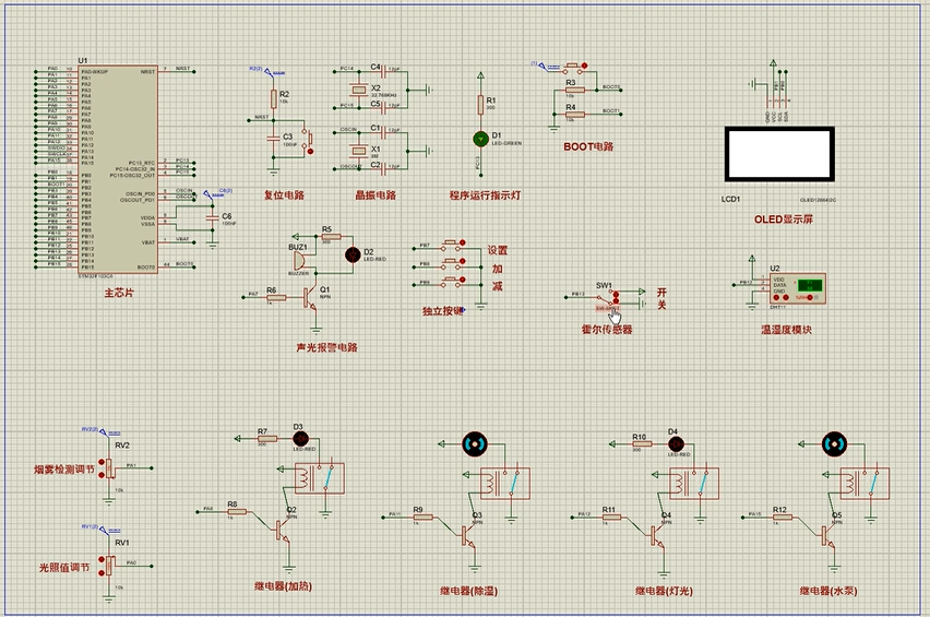 5、通过按键可设置各阈值,另外,可通过按键手动控制加热、除湿、照明、水泵