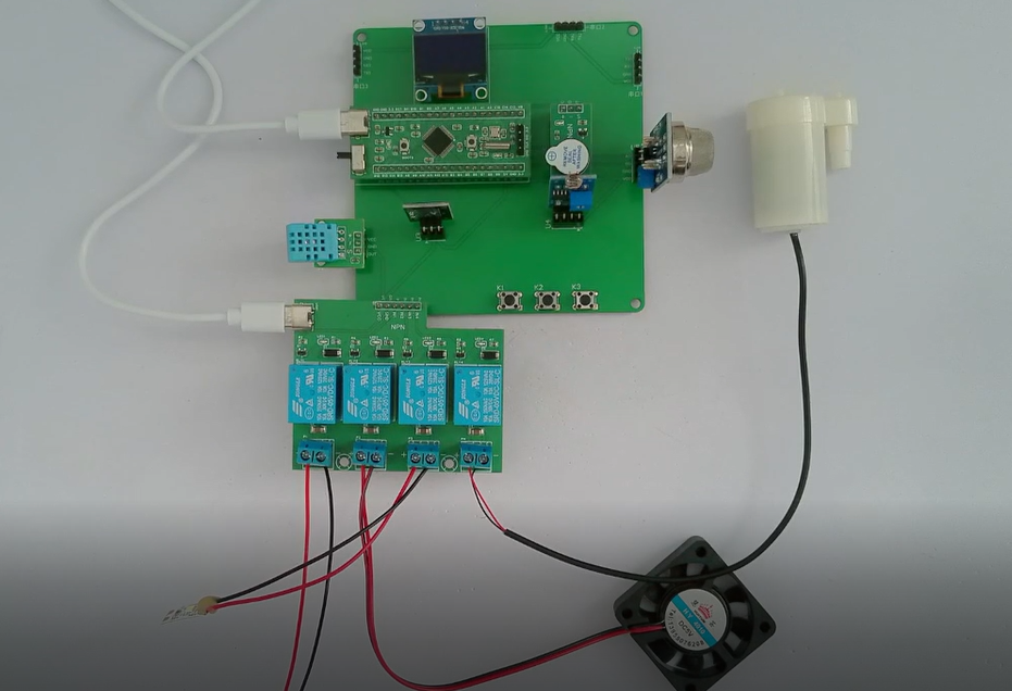 4、通过MQ-2检测烟雾值,当烟雾值大于设置最大值,启动水泵灭火,并声光报警提醒