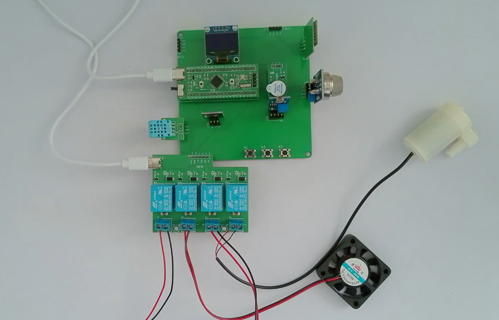 4、通过MQ-2检测烟雾值,当烟雾值大于设置最大值,启动水泵灭火,并声光报警提醒